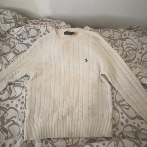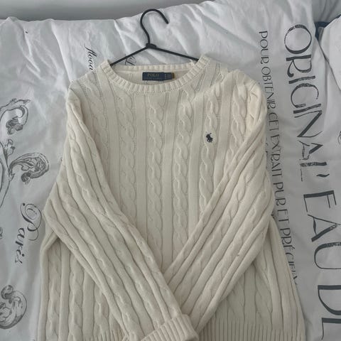 Ralph Lauren Polo herrtröja i storlek M. Tröjan är grå och stickad i bomull med kabelstickat mönster. Rund halsringning och broderad logotyp på bröstet. Passar som vardagströja eller som ett extra lager vid kallare väder.