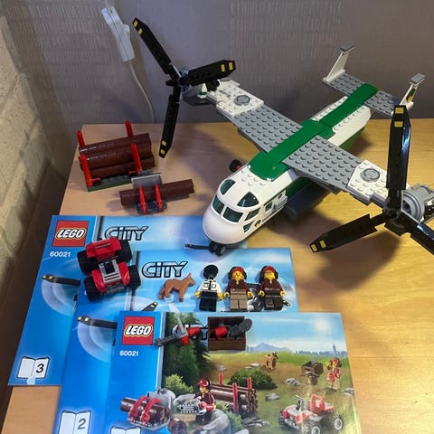 Sällsynt och gammalt LEGO City flygplan i vit och blå färg. Modellen består av byggklossar som tillsammans bildar ett passagerar-/transportflygplan med två propellrar, vingar och stjärtparti. Passar som leksak eller samlarobjekt inom LEGO City-serien. Alla bitar ingår.