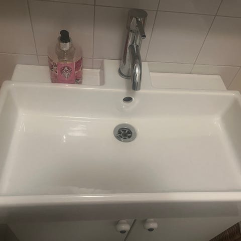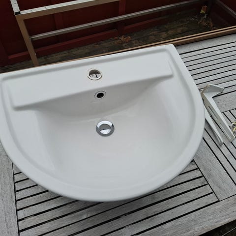 Tvättställ med underskåp i vit färg. Överdel i porslin med integrerat handfat och blandare monterad.