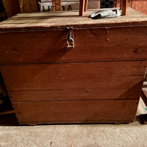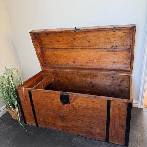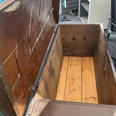 Antik träkorg med vacker patina, LxBxH 88x46x27 cm.
