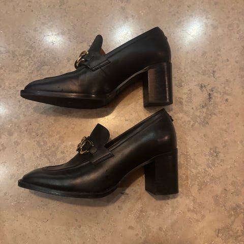 Tamaris loafers för dam i storlek 38. Skorna är svarta med dekorativt metallspänne framtill och har låg blockklack. Modellen passar för vardag och arbete samt kan kombineras med både byxor och kjol. Materialet ser ut att vara slätt syntet- eller läderliknande överdel med syntetsula. Klassisk design som ger ett neutralt och stilrent intryck.