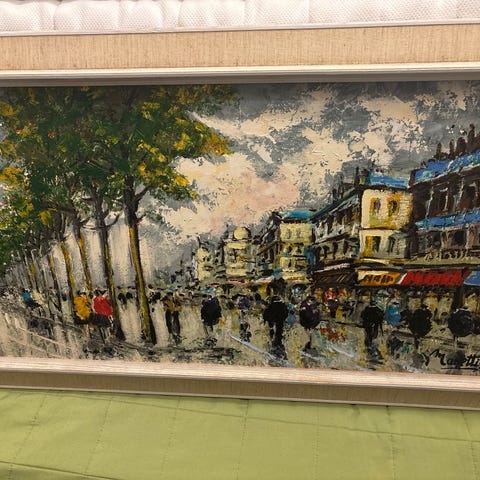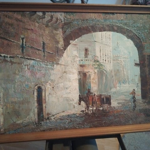 Calvan tavla med stadsmotiv föreställande en bro och byggnader längs vattnet. Möjligen Pont neuf. Målningen är rektangulär och inramad i guldfärgad ram.