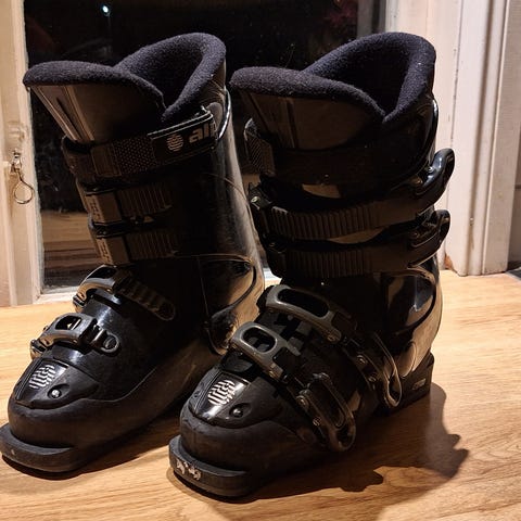 Helsvarta Strolz herrpjäxor med några år på nacken. Sammantaget använda 2-3 veckor. Stl 44,5-45. Pjäxans längd 319mm.