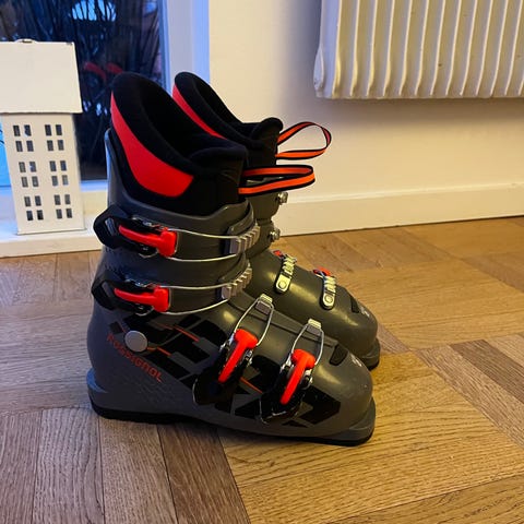 Head RS 60 pjäxor i storlek 240–245 mm. Modellen har hårt yttre skal med fyra justerbara spännen och powerstrap upptill för stabil passform. Färgen är svart med röda detaljer och röd innersko. Passar för alpin åkning i pistskidbacke.