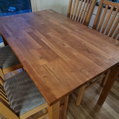 Matbord med fyra stolar i trä, brun färg. Stolarna har sitsar med dynor. Passar som köksbord eller matbord i mindre till medelstora rum.