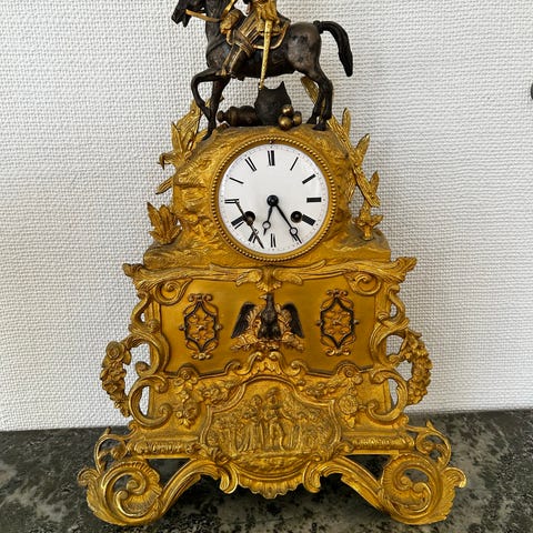 Amour et Psyché bordspendyl utformad som en figurativ skulptur i mörk patinerad metall, monterad på en sockel i ljus marmor med ådring. Klockan är infälld framtill i skulpturens På marmorsockeln finns en skylt med texten "AMOUR et PSYCHÉ". Baksidan av urverket är täckt av ett rundat lock med dekorativt genombrottsmönster i metall.