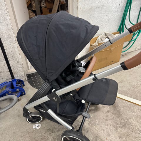 Beemoo sittvagn i grått tyg. Vagnen har fyra hjul med svängbara framhjul och större bakhjul. Justerbart handtag med vadderat överdrag. Ryggstödet är ställbart och suffletten är förlängningsbar för extra skydd. Förvaringskorg finns under sittdelen samt mindre förvaringsfack vid handtaget. Passar för ett barn som kan sitta själv. I använd fint skick, men behöver rengöras.