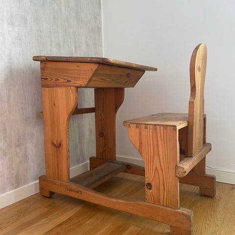 Klassisk antik skolbänk med tillhörande stol