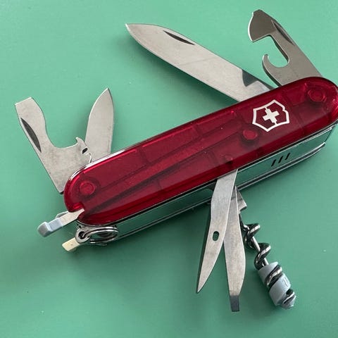 Schweizisk fickkniv i röd färg med flera funktioner. Kniven har bland annat ett huvudblad, mindre blad eller verktyg, korkskruv och ytterligare utfällbara verktyg. Passar för vardagsbruk, enklare reparationer och friluftsaktiviteter där ett kompakt multiverktyg behövs.