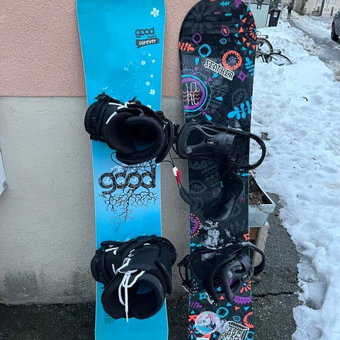 Warp snowboard med bindningar i blå färg. Pris 750kr. Ett par Ride Deuce snowboardboots i svart med gröna detaljer i storlek EUR 42. Pris 600kr. Ett par K2 Vandal snowboardboots i svart med röda detaljer i storlek EUR 35,5. Pris 400kr. Eller allt för 1500kr.