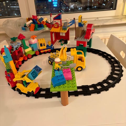 Lego Duplo klossar nummer- och djurtåg i blandade färger. Innehåller större byggklossar, hjulunderreden och delar för att bygga ett tåg med djurfigurer. Passar för yngre barn som vill bygga enkla fordon, djur och andra modeller. Levereras i förvaringslådor enligt bilderna.