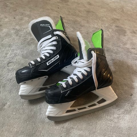 Bauer XLS ishockeyskridskor för barn i storlek 34. Skridskorna är svarta med vita och gröna detaljer samt vita snören. Modellen har högt skaft för stöd runt fotled och stabil plastklinga. Passar för ishockey och allmänhetens åkning på is för barn med skostorlek cirka 34.