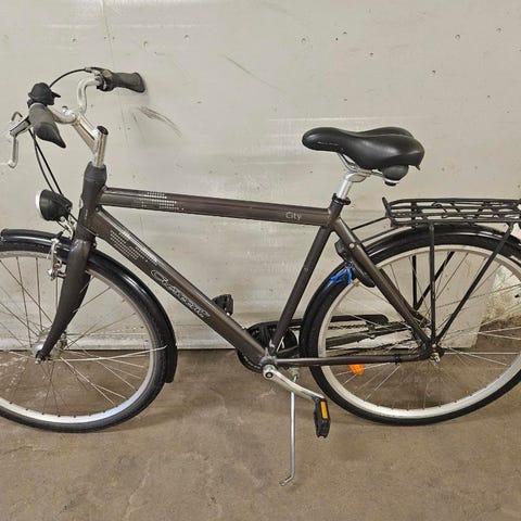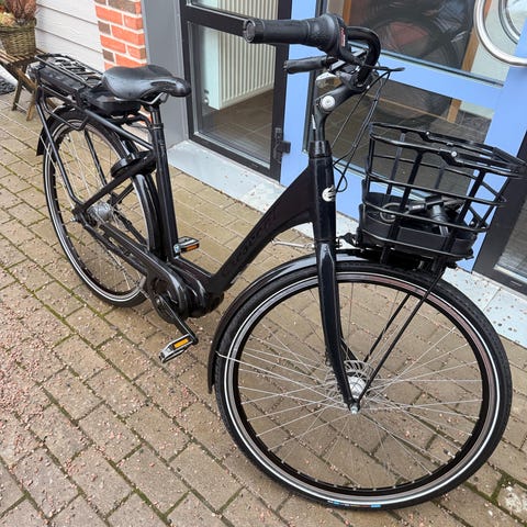 Batavus citybike med ramstorlek 53 cm och 28" hjul. Cykeln har lågt insteg, kedjeskydd, pakethållare bak och korg framtill. Utrustad med fotbroms bak och handbroms fram. Sadel och handtag i brun färg. Den är i mycket fint skick och har alltid sköts om väl.