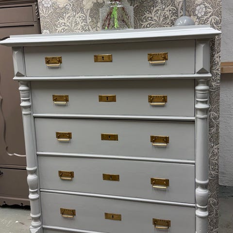 Mycket fin antik byrå i nyrenässansstil, troligen sent 1800-tal. Byrån är renoverad och målad i en beige färg med originalbeslag. Översta lådan är målad i en mullvadsgrå/brun färg, övriga lådor omålade. Alla lådor glider lätt.