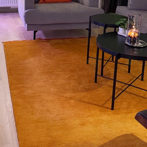 Handvävd matta i 100% ull, röllakan. Grå och vita nyanser. Några svaga fläckar på undersidan av mattan, se bilder. Storlek ca 208x280cm.