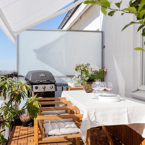 Ikea NÄMMARÖ utemöbelset med ett rektangulärt bord och fyra positionsstolar. Setet är avsett för utomhusbruk och är tillverkat i trä med ljusbrunlaserad yta. Bordet är cirka 140 cm långt. Stolarna är fällbara och har justerbar rygg för olika sittlägen. Passar exempelvis på altan, balkong eller uteplats.