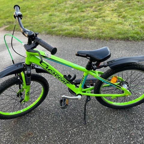 Crescent barncykel med 7 växlar, fot & handbroms. Stänkskydd o belysning fram o bak. Lite missfärgad på sina ställen men funkar fint i funktion. Priset speglar även detta.