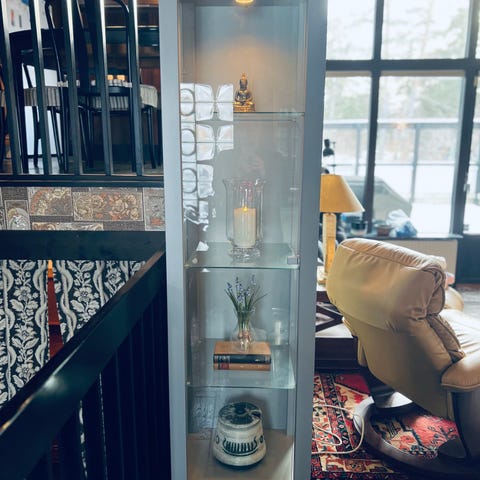 Vitrinskåp i trä med glasdörrar och förvaring
