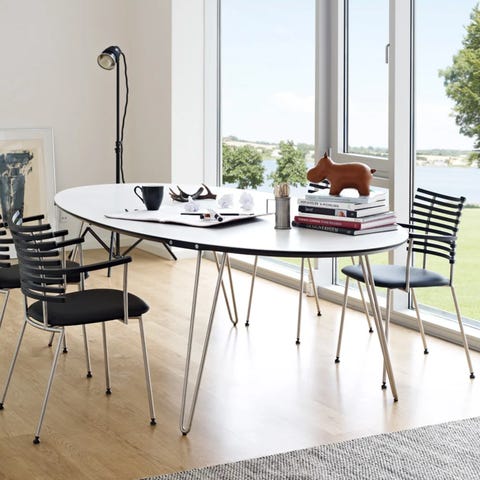 Ljusgrått underrede i stål med bordsben som ger plats för 6 st stolar.