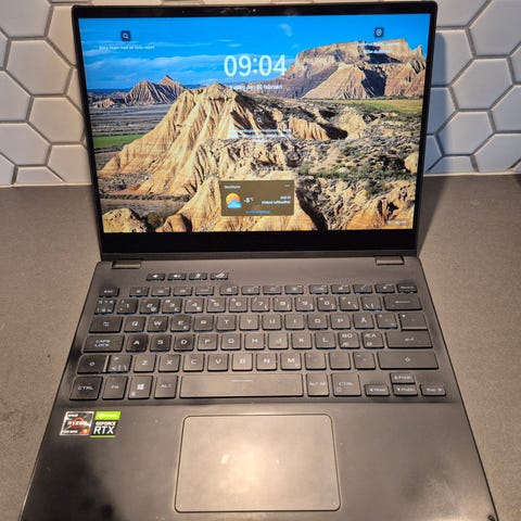 MSI Katana GF76 11UD laptop med 17,3-tums skärm, svart färg och tangentbord med röd bakgrundsbelysning. Utrustad med Intel Core i5-11400H processor, 16 GB DDR4 RAM, 512 GB SSD-lagring och NVIDIA GeForce RTX 3050 ti grafikkort. Operativsystem Windows 11.