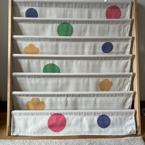 Hyllan är utformad som en frontad bokförvaring med flera tygfack där böckerna kan ställas med framsidan utåt.