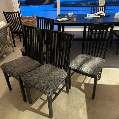 Lilla Åland Stolab Carl Malmsten pinnstol svart 6 st med gråa Fårskinns dynor.