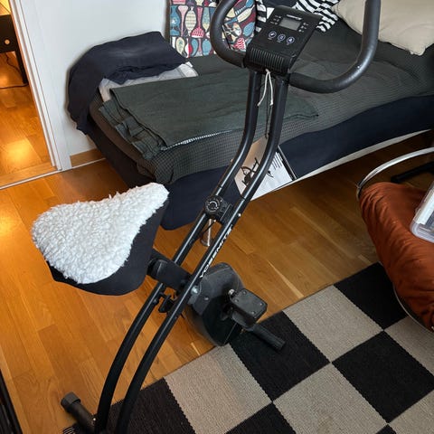 sig under skrivbordet efter att man har satt sig på cykeln.