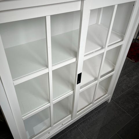 Litet vägghängt vitrinskåp trä med glasdörrar