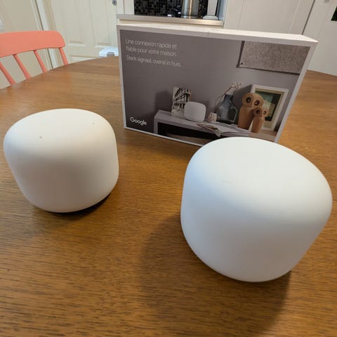 TP-Link Deco X60 AX3000 mesh-router i vit färg, 3-pack. Systemet är ett Wi-Fi 6 mesh-nätverk avsett för trådlös täckning i hem eller kontor. Varje enhet fungerar som en nod i nätverket och kan placeras på olika platser för att förbättra signalstyrkan. Routrarna har stöd för AX3000-hastigheter och är anpassade för att hantera flera enheter samtidigt. Levereras med nätadaptrar till varje enhet enligt bild.