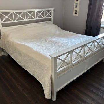 Sängram för dubbelsäng i vitlaserad furu. Modellen har hög huvudgavel och fotgavel med dekorativa paneler. Träribba i mitten för extra stöd samt två hela bottenplattor för madrasser. Passar som stabil sovplats i sovrum. Madrasser ingår inte.