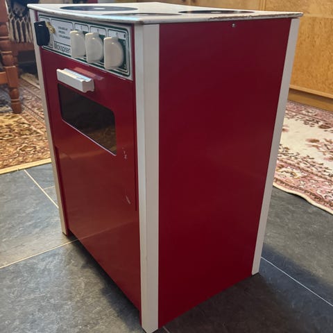 Micki leksaksspis i röd färg. Spisen har fyra plattor på ovansidan och vred i olika färger på fronten. Ugnslucka med fönster framtill. Avsedd för barnlek i kökshörna eller lekrum. Tillverkad i trä och andra material anpassade för leksaker.