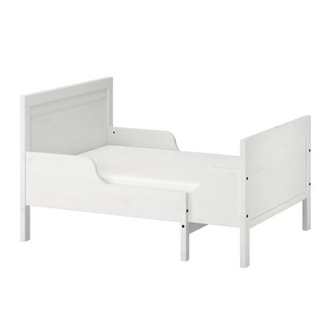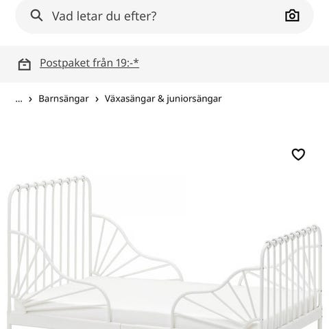IKEA juniorsäng i vitlackerad metall. Sängen har dekorativa gavlar och sidoskydd som hjälper barnet att inte rulla ur sängen.