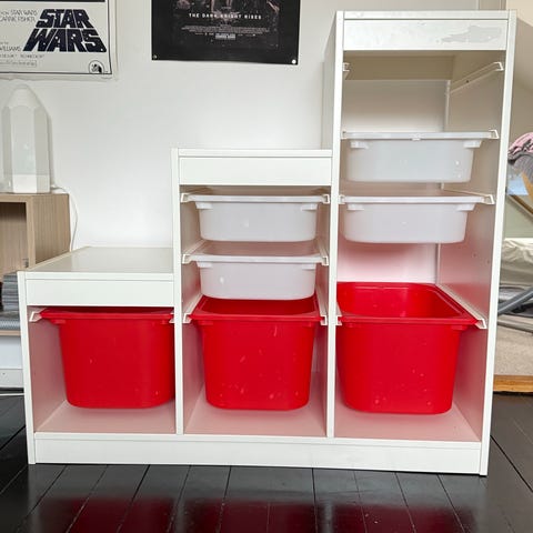 IKEA barnförvaringshylla i vit färg. Hyllan har fyra öppna fack som kan användas för förvaring av leksaker, böcker eller annat barnrelaterat material. Passar i barnrum eller lekhörna för överskådlig och lättillgänglig förvaring.