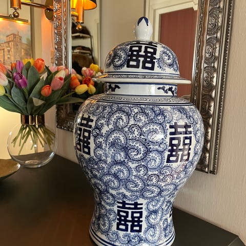 Säljer en stor vacker blåvit urna med lock/lockurna från Newport.