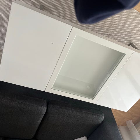 Vitt soffbord med glasskiva och två utdragbara lådor för förvaring. Bordet har en praktisk hylla under glasskivan. Perfekt för vardagsrummet.