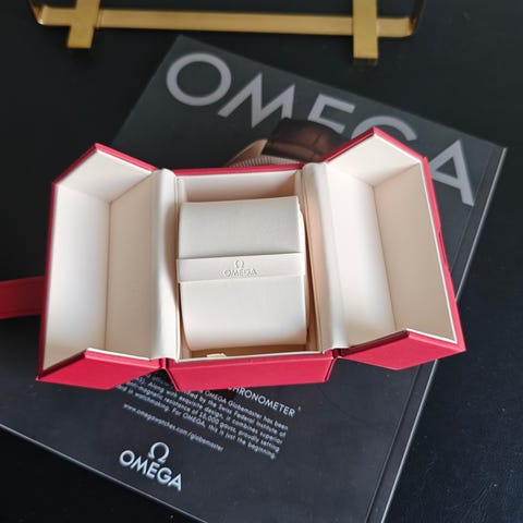 Omega smyckesask i röd färg. Utsidan är röd med markerade sömmar och ett litet metallfärgat lås. Insidan har röd botten och ljus ovandel med Omega-logotyp. Lämplig för förvaring eller presentation av mindre smycken eller klockrelaterade accessoarer.