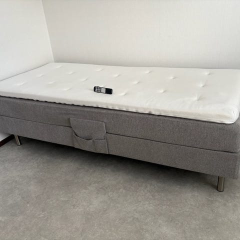 Ekens Essens ställbar säng i grått tyg. Sängen har elmotordriven ställbar funktion för huvud- och fotända, styrd med fjärrkontroll. Madrassen är märkt med fastheten medium. Träram med ben i trä. Passar som enkelsäng i sovrum eller gästrum där man önskar justerbar ligg- och sittposition.