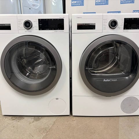 Bosch kombinerad tvättmaskin/torktumlare i vit färg. Frontmatad modell med glaslucka och kontrollpanel ovanför luckan. Maskinen är avsedd för både tvätt och torkning i en och samma enhet, vilket sparar plats. Passar för installation i badrum, tvättstuga eller andra utrymmen med vattenanslutning och avlopp. Exakta mått, kapacitet och energiklass framgår normalt av typskylten på maskinen.
