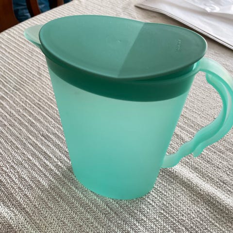 Tupperware tillbringare 1 L med lock i plast i blått med gult lock. Muggen har handtag och är lämplig för drycker som vatten, saft eller andra kalla och varma drycker. Passar för användning i kök, på resa eller till picknick där ett spillreducerande lock är önskvärt.