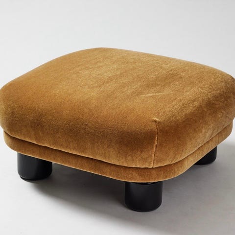 H&M Home bänk i beige tyg. Rektangulär sittdel med mjuk stoppning och rundade hörn. Klädd i slätt, sammetsliknande textil. Står på fyra runda ben i mörk färg. Passar som extra sittplats eller fotpall i vardagsrum, hall eller sovrum.