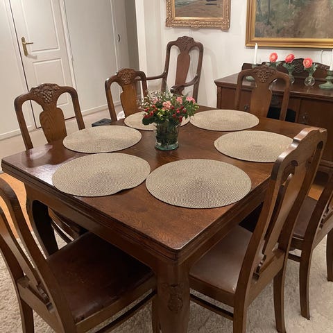 Gedigen antik matgrupp i trä med bord (två iläggsskivor finns), åtta stolar varav två med karm och en skänk. Allt i väldigt gott skick.