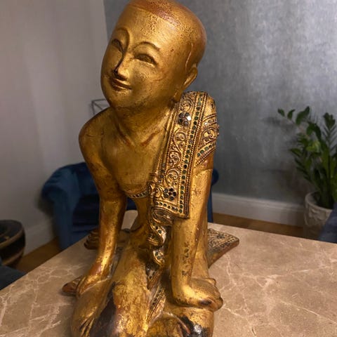 Staty föreställande en knästående buddhafigur med händerna i böneposition. Figuren har detaljerad dräkt och huvudbonad och är utförd i guldfärgad finish. Passar som inredningsdetalj i hemmet, exempelvis i vardagsrum eller hall, eller i ett rum för meditation och avkoppling.