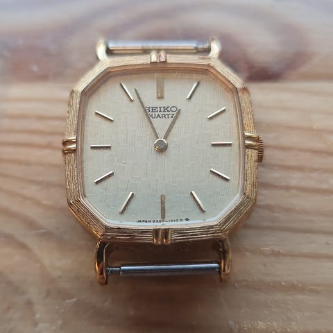 Rado Quartz damklocka med guldfärgad boett och armband. Klockan har datumvisning. Boetten mäter 23 mm i diameter. Armbandet är tillverkat av metall.