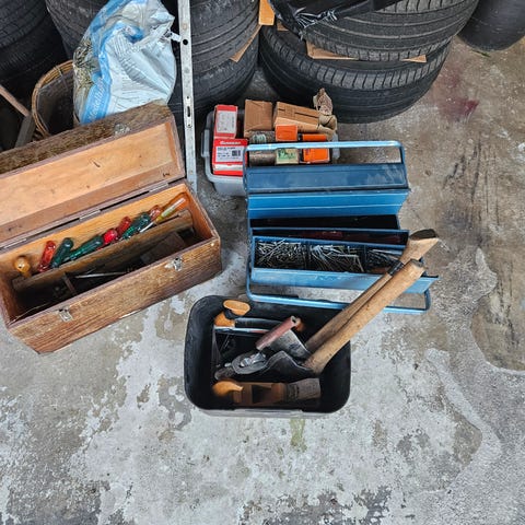 Uppsättning murar- och putsverktyg bestående av flera olika spacklar, murslevar och hink. Verktygen lämpar sig för arbete med puts, murbruk och spackel vid renovering och byggprojekt. 11st