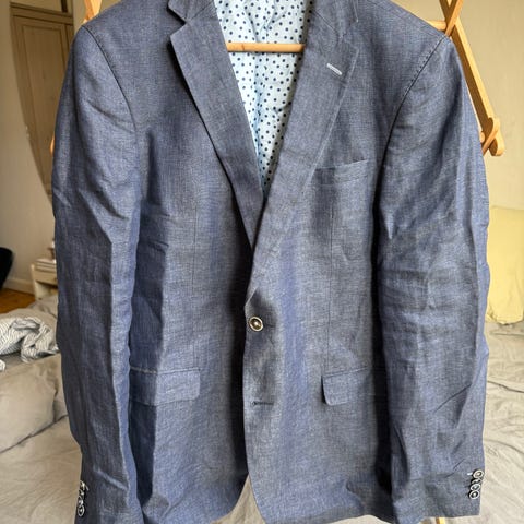 Mörkblå strukturerad kavaj från Massimo Dutti i storlek EUR 46 (USA 36). Elegant mönstrat innerfoder och tvåknäppt design med dubbla vents bak. Bra skick utan defekter. Nypris ca 900–1 400 kr. Bra skick – inga skador, hål eller fläckar synliga. Viss lätt formförlust vid ärmar/framkant kan åtgärdas med ångning.