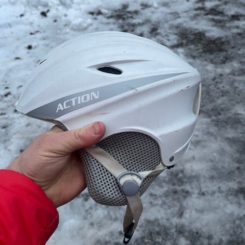 Ett set med skidkläder är i mycket bra stick bestående av en vit jacka från Cross Sportswear (st XS) och ett par svarta skidbyxor från CMP (st 164). Dessutom ingår en vit skidhjälm från Wedze (st M 55-59) och ett par skidglasögon som passa till skidhjälm.