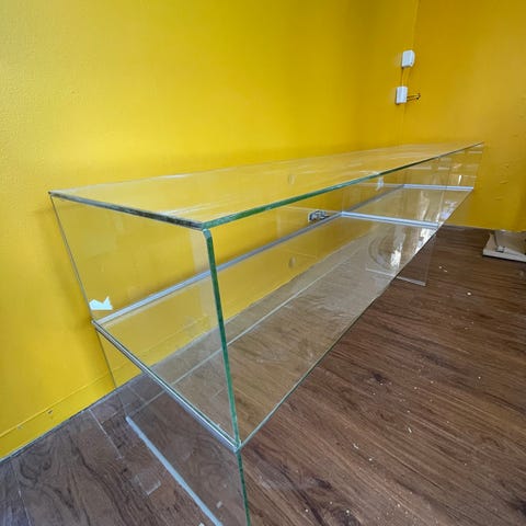 Robust rektangulär Glaslåda som köptes ny i butik som då var ett akvarium. När det inte blev fiskar så kom det till användning som förvaring, har haft inne i badrummet och förvarar toarullar i. Men valmöjligheterna är stora allt ifrån förvaring, stor kruka eller varför inte använda det som ett akvarium som det är tänkt ifrån början?
