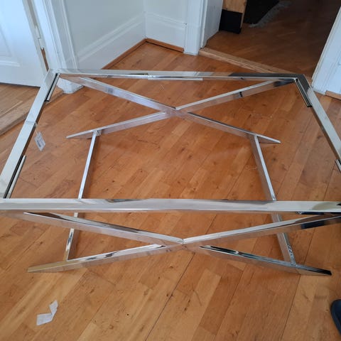 Designerbord med geometriskt format underrede i krom (eller kanske rostfritt stål?). Glasskivan är 1,5 cm tjock och har snygg fasad kant.