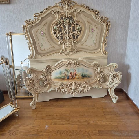 Exclusivt italiensk sängram (demonterad). I handgjord massivt ädelträ. Bredd 110cm.