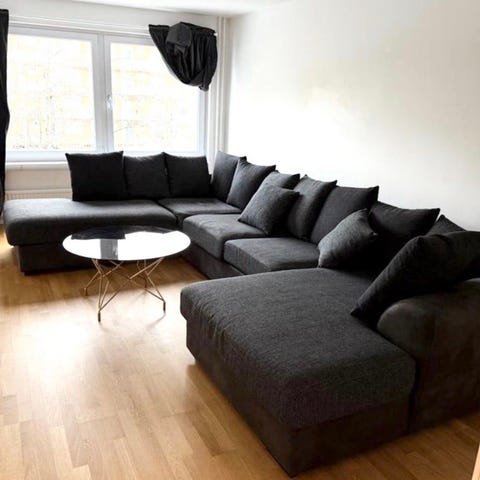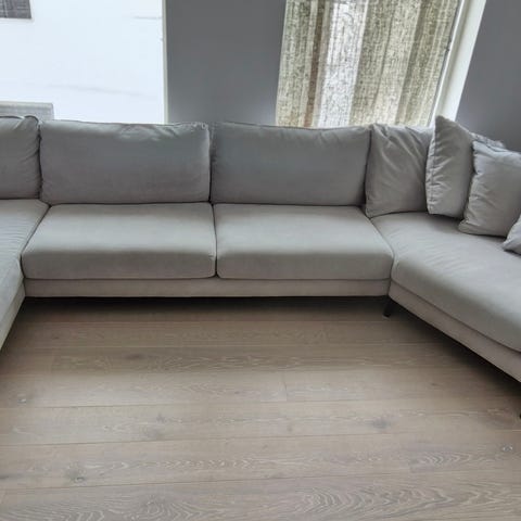 Superskön stor soffa som vi tyvärr behöver avyttra då den inte får plats i vårt nya boende. Hel och ren i ljusgrå färg , inga revor eller slitage i dynor och kuddar! Djur- och rökfritt hem. Den här soffan levererar så välkomna att fynda!